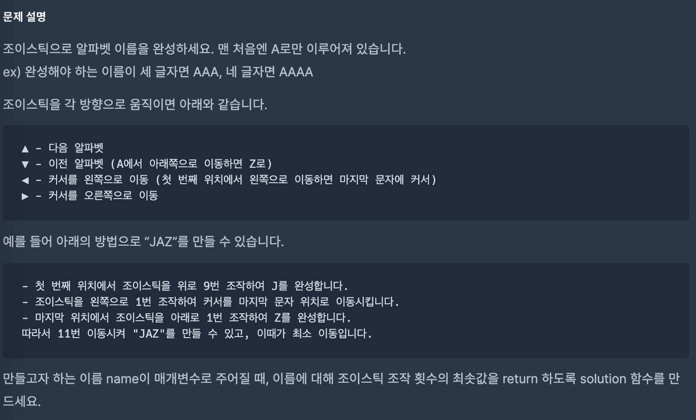 조이스틱으로 알파벳 이름을 완성하세요. 맨 처음엔 A로만 이루어져 있습니다. ex) 완성해야 하는 이름이 세 글자면 AAA, 네 글자면 AAAA 조이스틱을 각 방향으로 움직이면 아래와 같습니다. ▲ - 다