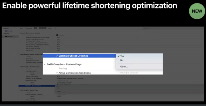 Xcode13을 사용하면 Swift컴파일러에서 build setting에 "Optimize Object Lifetimes"라는 새로운 경험을