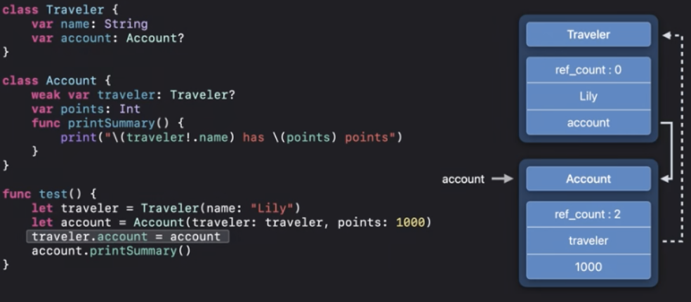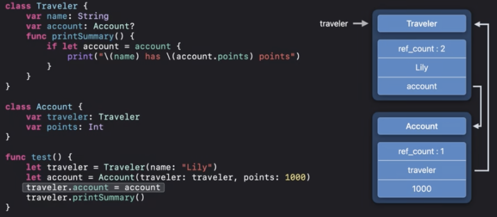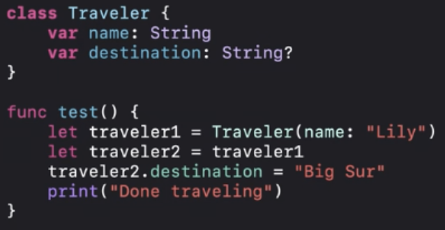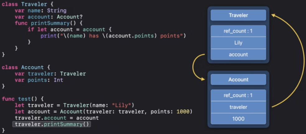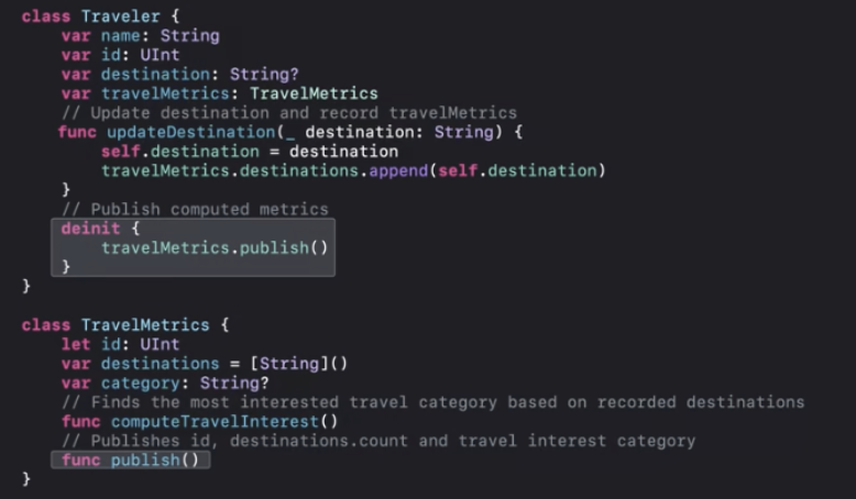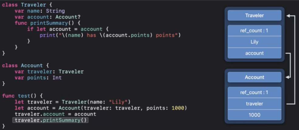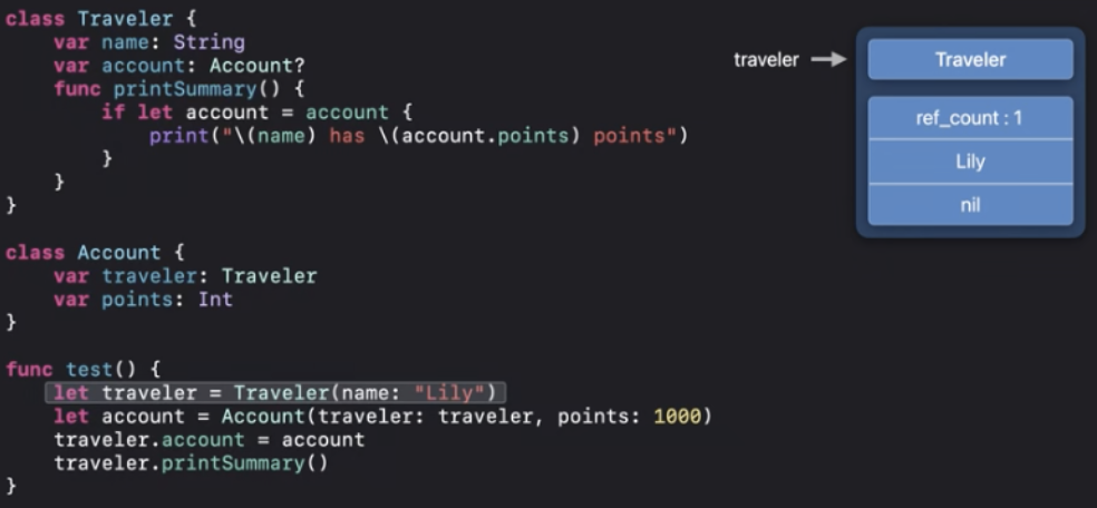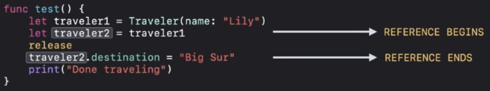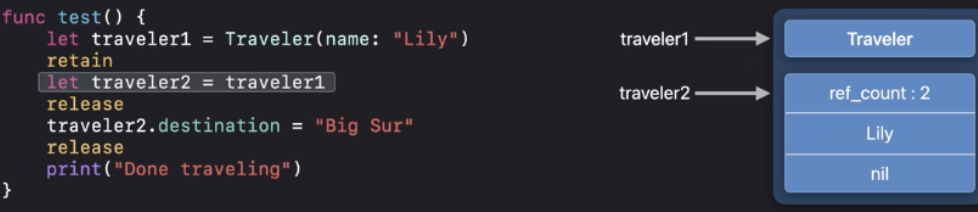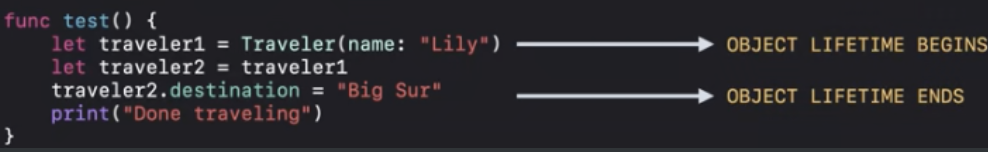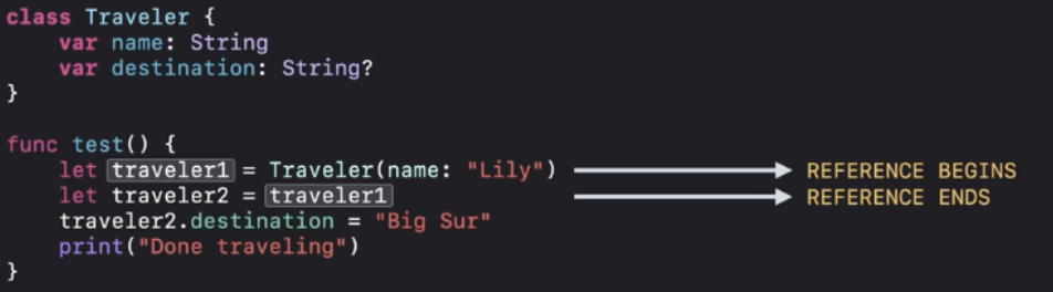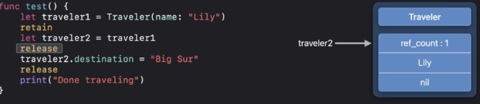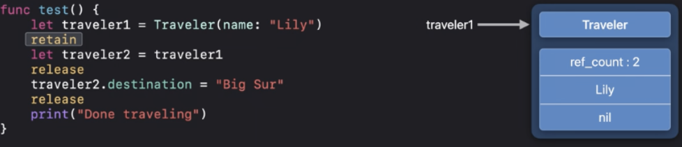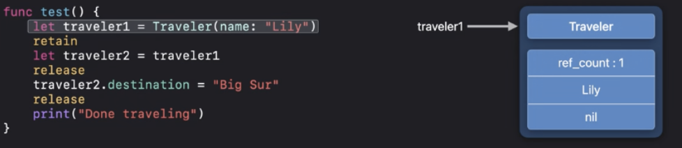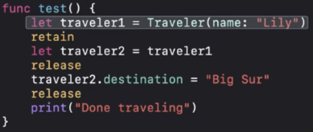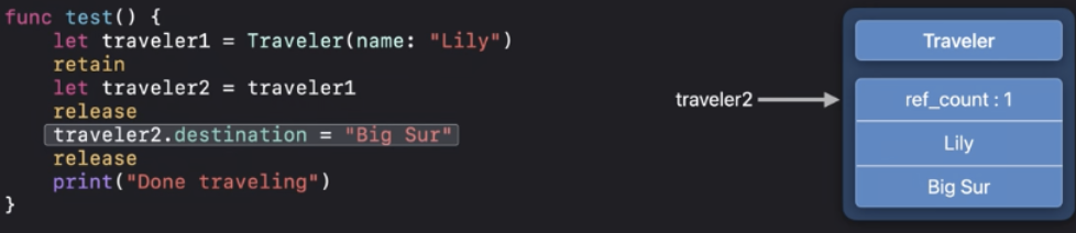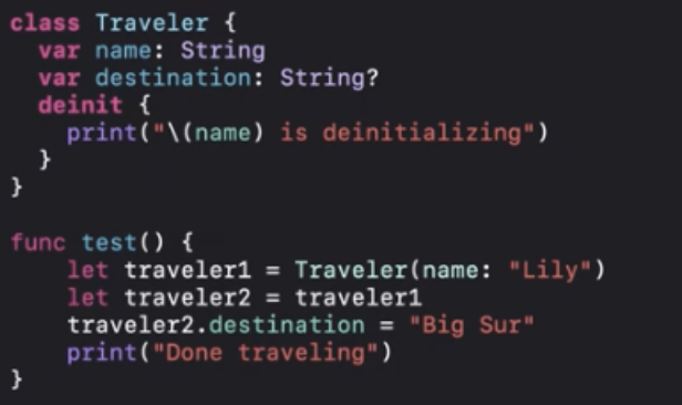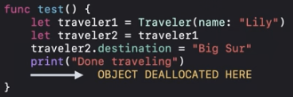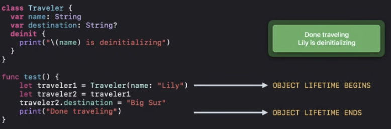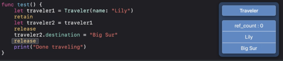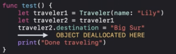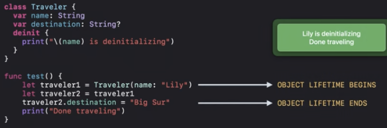 ARC최적화에 따라서 "Done traveling"이 인쇄되기 전에 deinit을 실행할 수 있어요