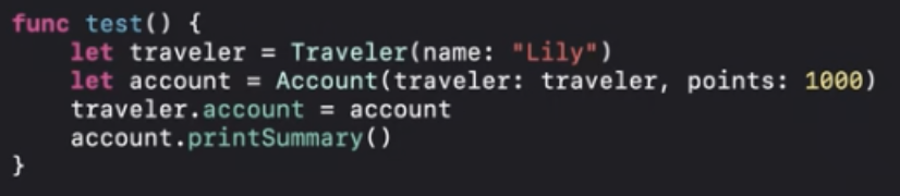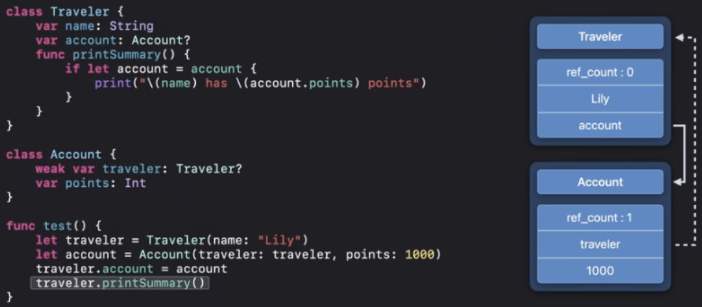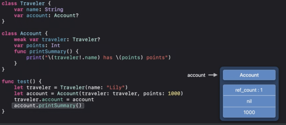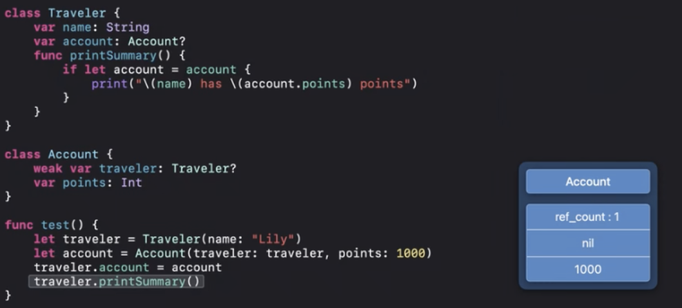 여기서 printSummary()함수를 다시 Traveler클래스로 이동하고 Account클래스의 약한참조를 private처리 했습니다.