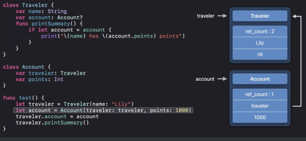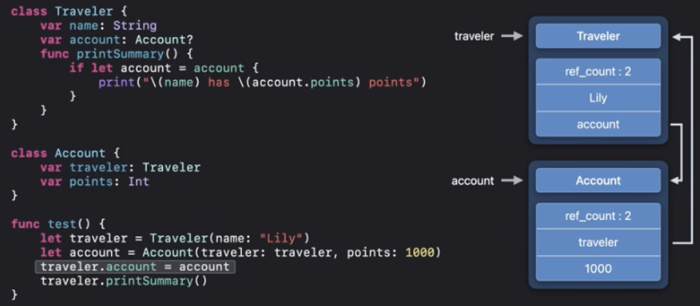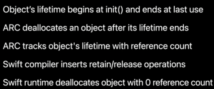- ARC는 주로 스위프트 컴파일러에 의해 retain와 release를 삽입하는 작업을 구동