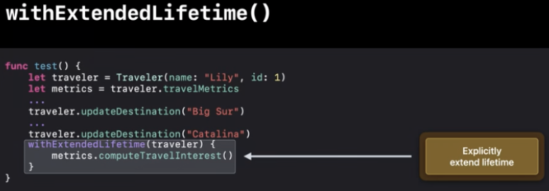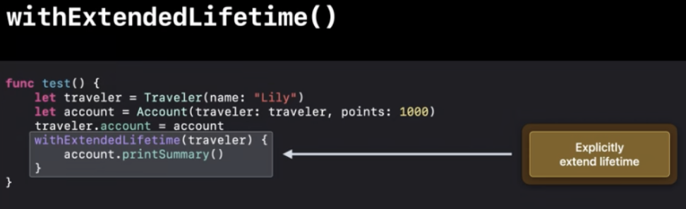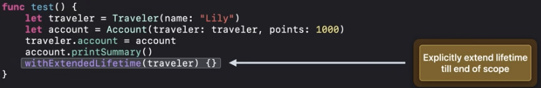 스위프트는 객체의 수명을 명시적으로 연장할 수 있는 withExtendedLifetime()를 제공해요