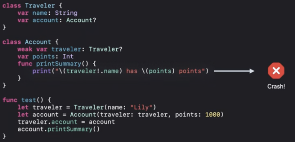 이러한 일이 일어난다면 Swift런타임이 weak에 대한 접근은 nil로 안전하고