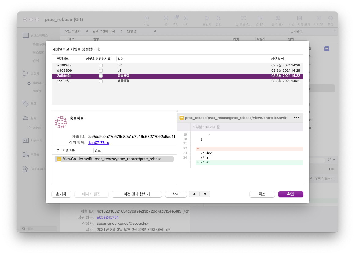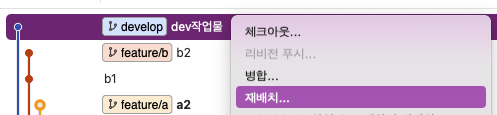 rebase시켜서 develop브렌치 뒤로 a브렌치에서 한 작업물이 뒤로 오도록 변경됬고