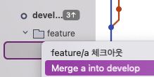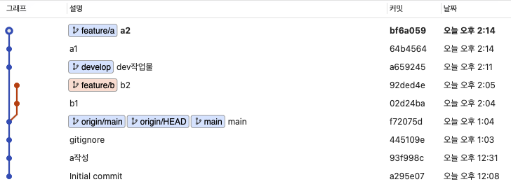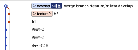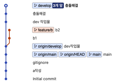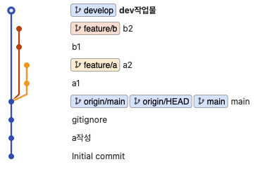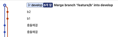 커밋 시간순으로는 a -> b -> develop 브렌치 순이죠
