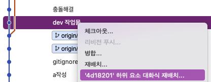 붙이고싶은 부모 커밋에 오른쪽버튼 >> 재배치