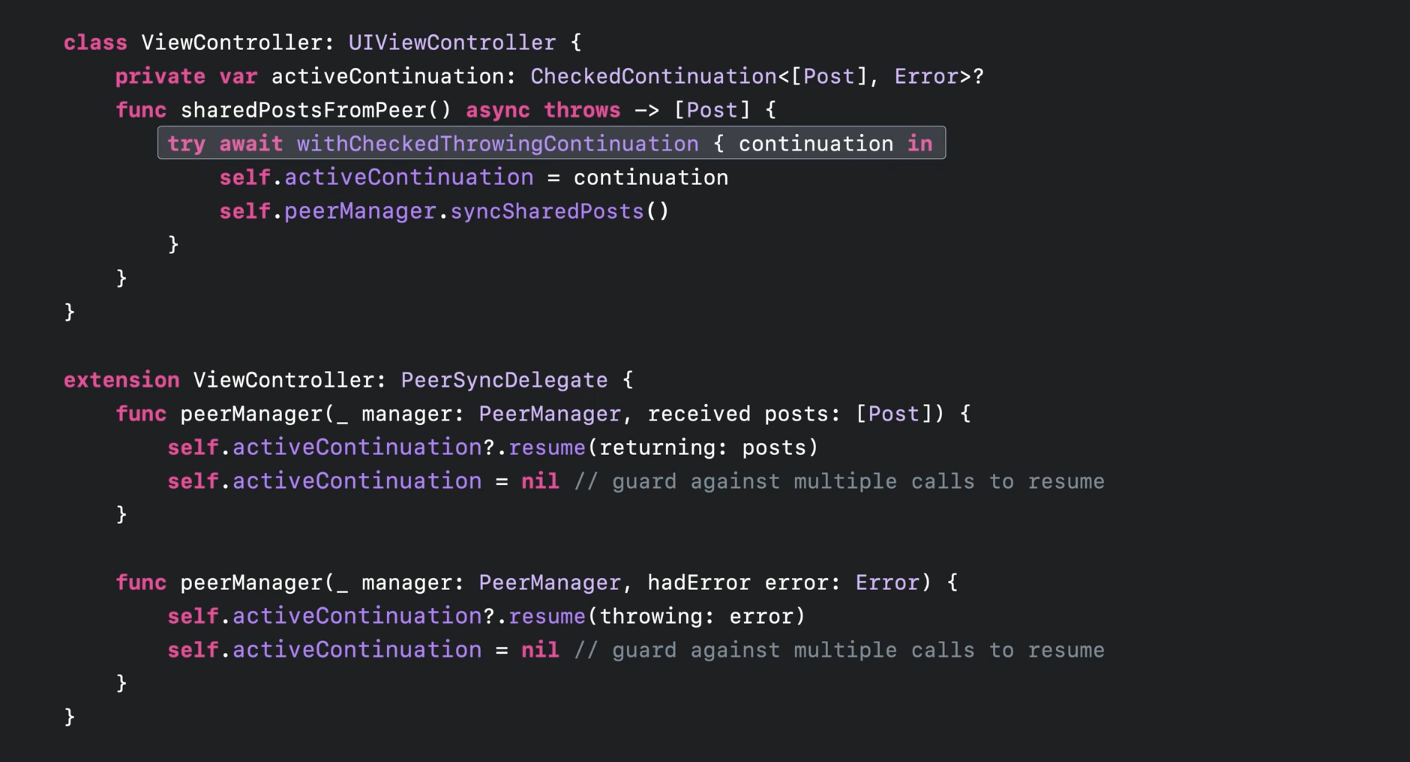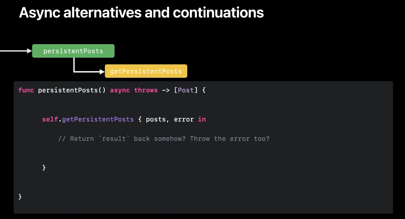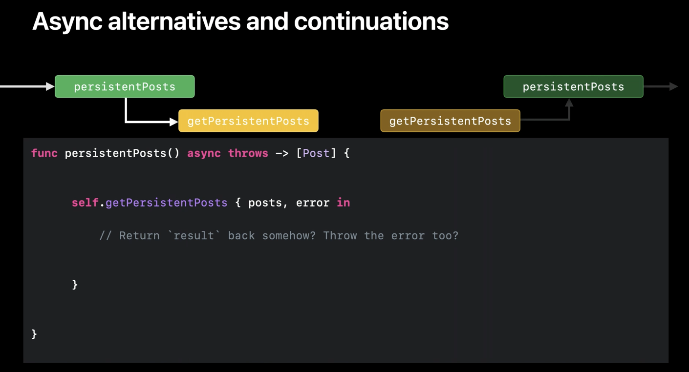 빠진 것은 completion handler를 await하고 요청의 결과로 재개하는 bridge이다.