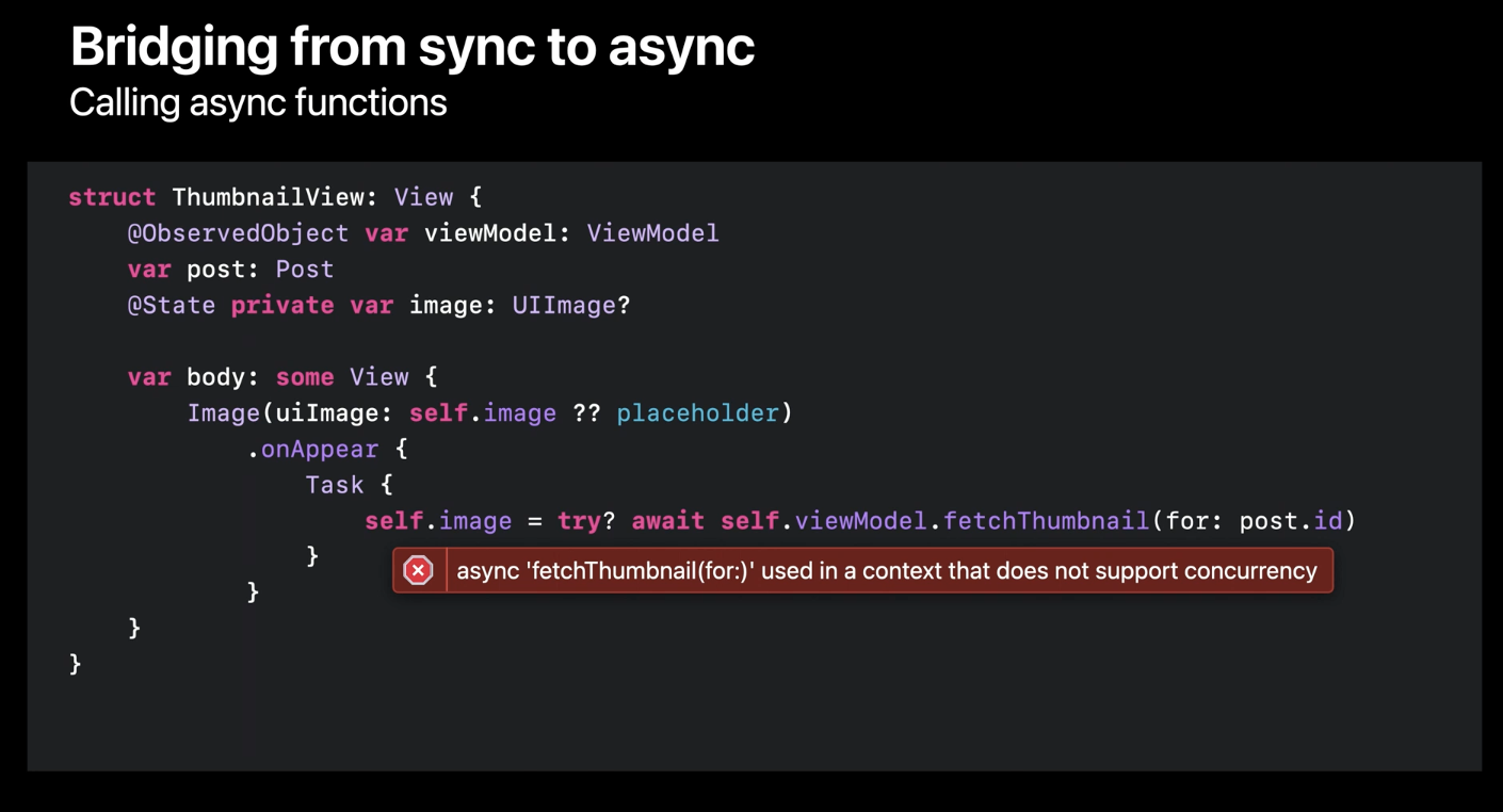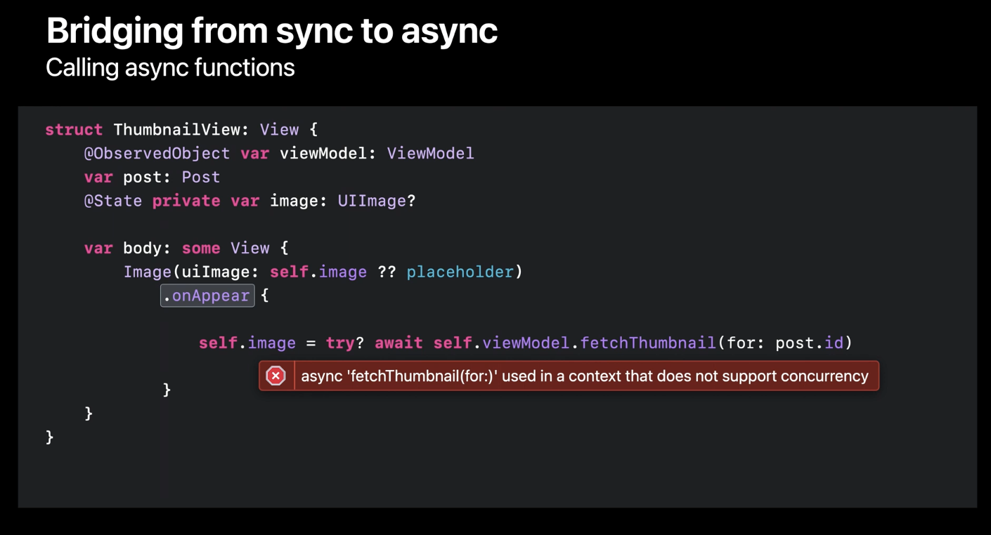 여기서 onAppear수식어는 일반적이고 비동기가 아닌 클로저이므로 동기식과 비동기식 사이의 격차를 메울 방법이 필요합니다.