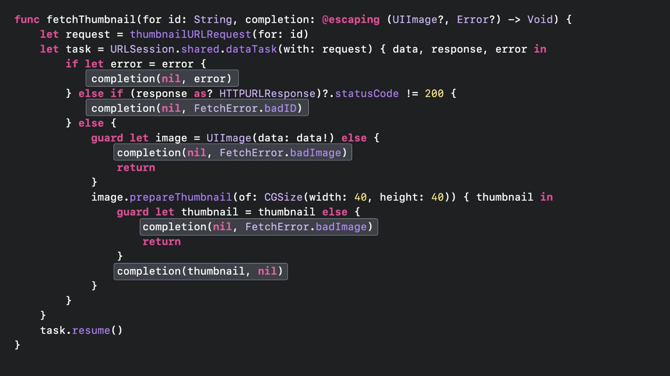 completion handler와 달리 썸네일 렌더가 되지않은경우 스위프트는 에러 또는 값을 반환하도록 보장합니다.