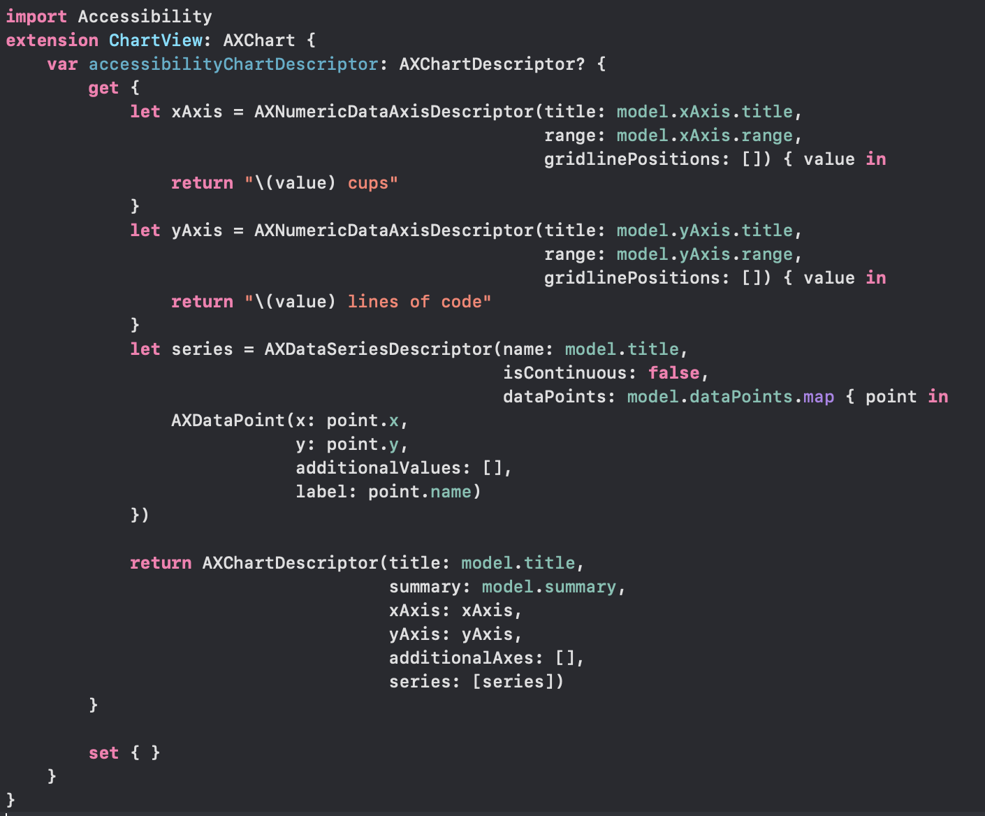accessibilityChartDescriptor 프로퍼티만 구현하면 되기때문에 쉽습니다.