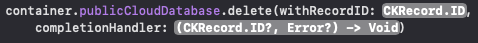 container.publicCloudDatabase.delete(withRecordID: id) { recordID, error in