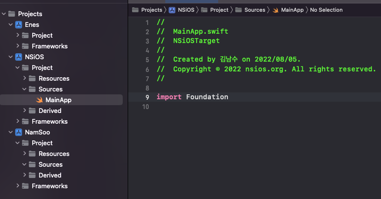 그아래로 NSiOS, NamSoo, Enes폴더를 각각 만들어주고