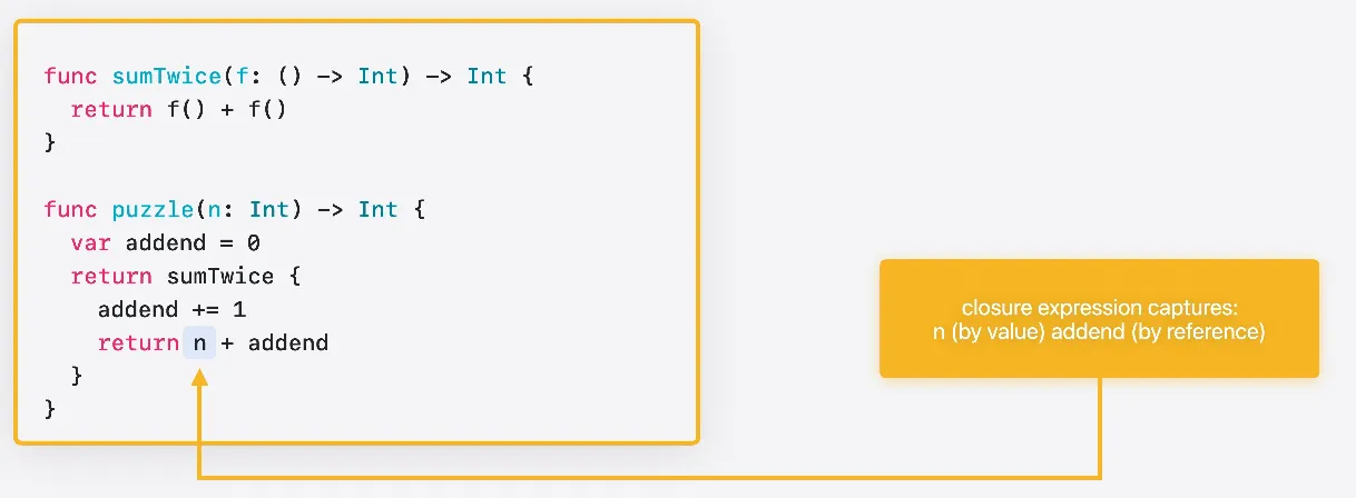 Swift의 클로저에서 로컬 변수를 참조할 때는 변수의 레퍼런스를 사용합니다 따라서 변수를 수정할 수 있으며 기존 범위와 현재 범위에 변경사항이 모두 반영됩니다(addend은 Ref타입)