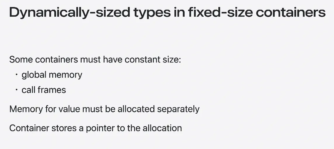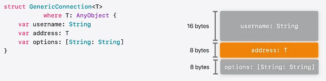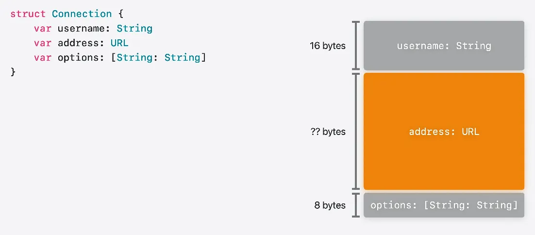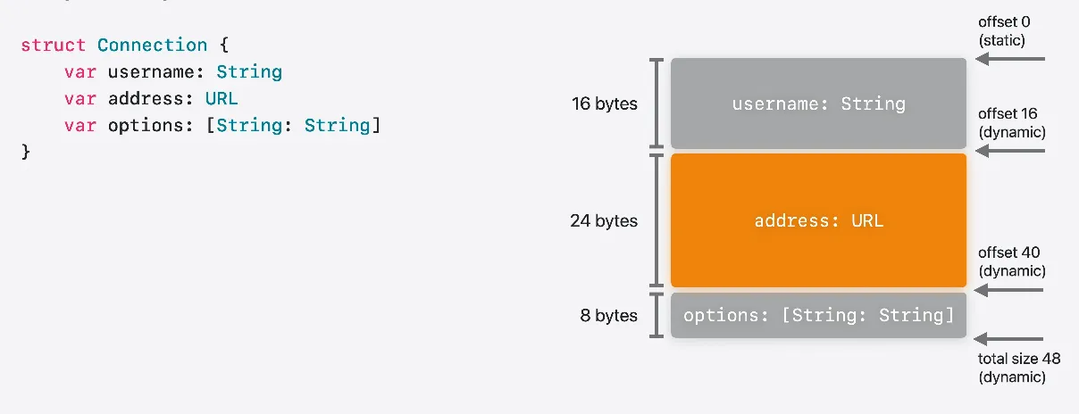 예를 들어 첫번째 Connection 구조체에는 URL이 있습니다 URL의 레이아웃을 정적으로 알 수 없으므로 Connection의 레이아웃도 정적으로 알 수 없습니다 하지만 괜찮습니다 Connection을 담고 있는 컨테이너에 문제가 될 뿐이니까요 컴파일러는 Connection의 첫 번째 동적 크기 속성에 도달할 때까지의 정적 레이아웃을 파악할 수 있습니다 나머지 레이아웃은 Swift가 런타임에 프로그램에서 처음으로 이 유형의 레이아웃이 필요할 때 동적으로 채웁니다