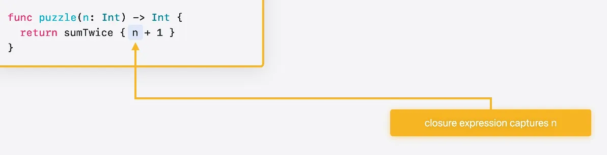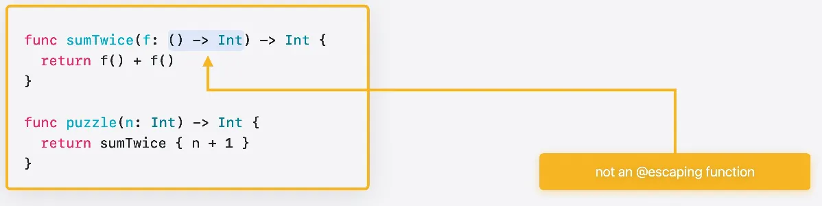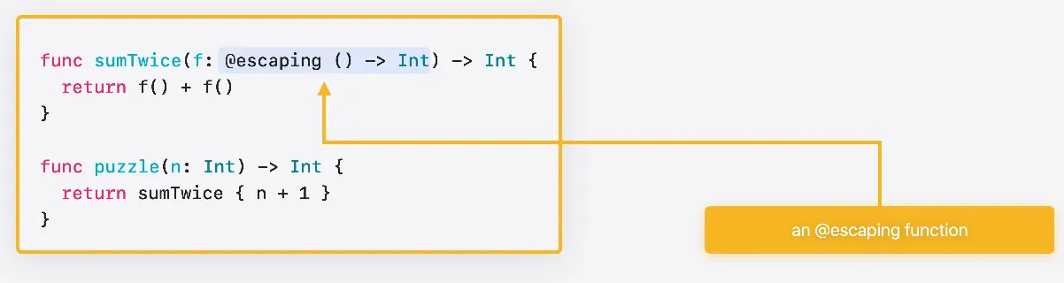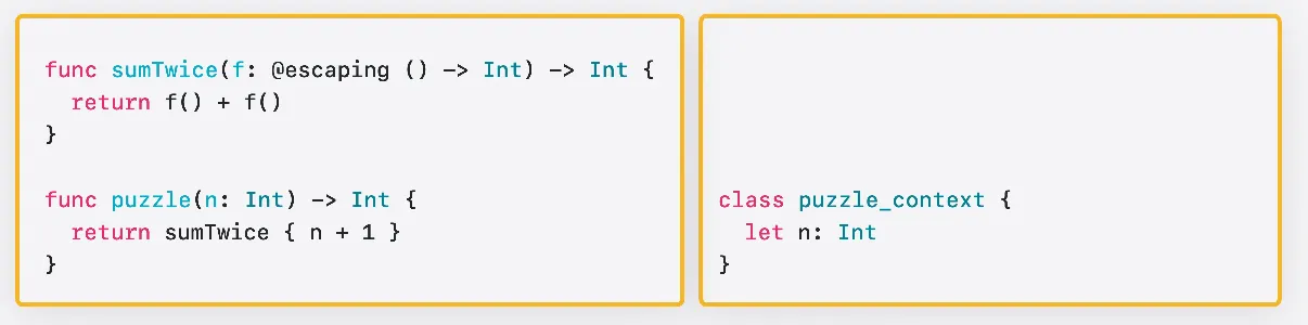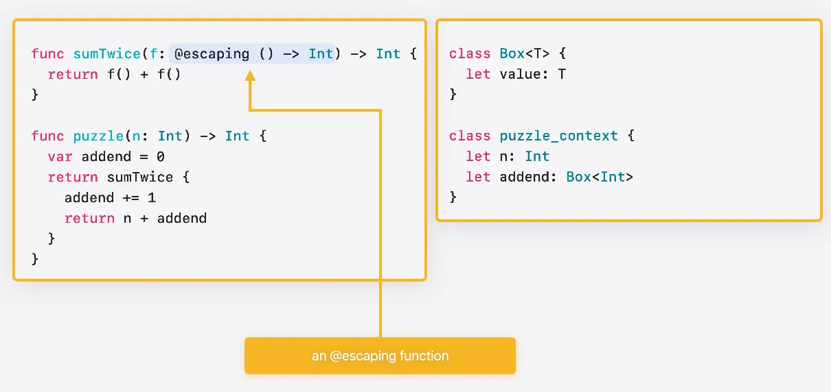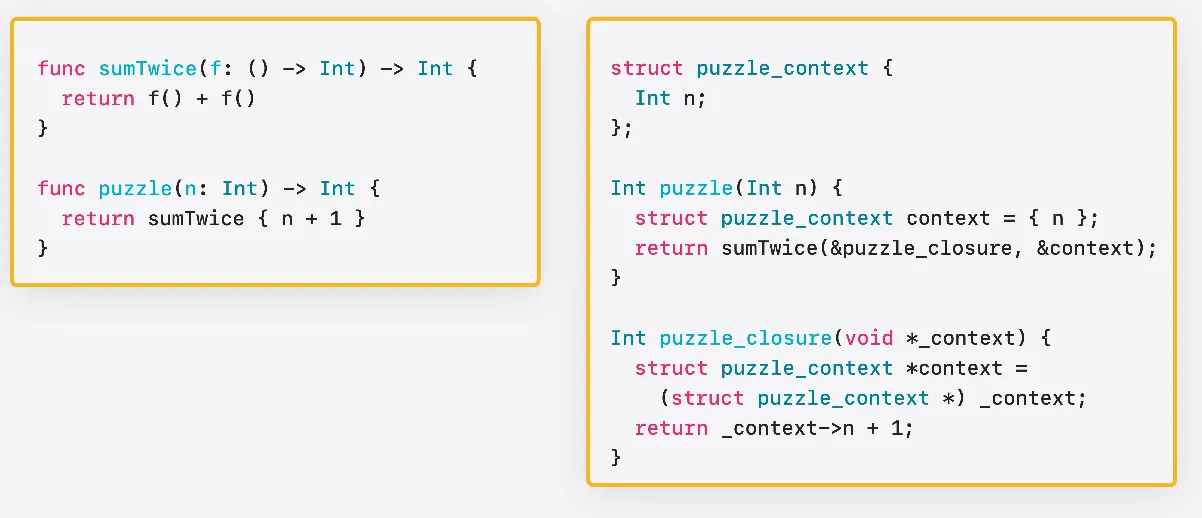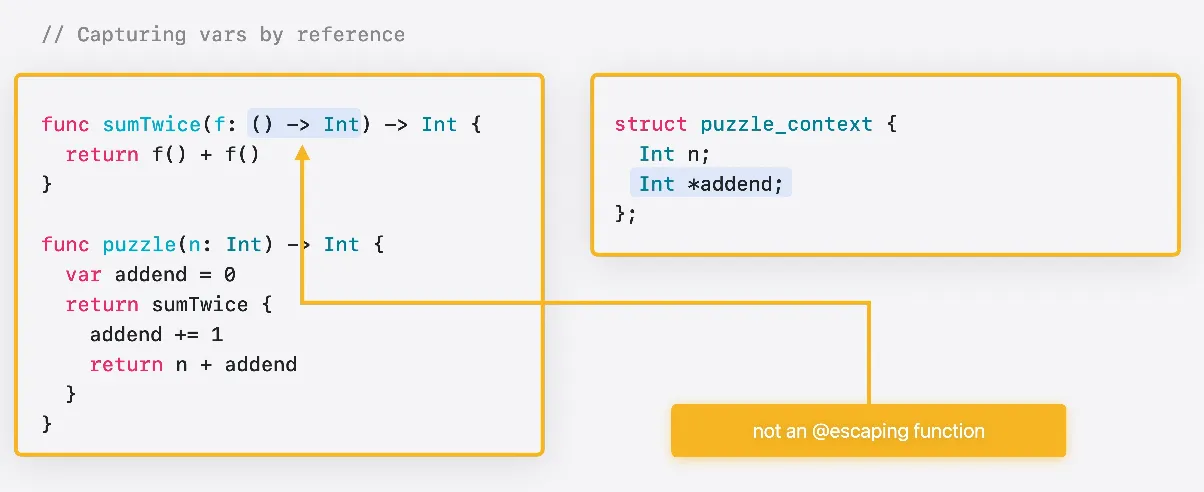 클로저는 함수 유형의 값을 전달하는 데 사용됩니다 이 함수는 탈출 불가 함수를 인수로 받습니다 Swift에서 함수 값은 항상 함수 포인터와 컨텍스트 포인트의 쌍으로 구성됩니다 C에서는 이 함수의 시그니처가 다음과 같이 표현됩니다