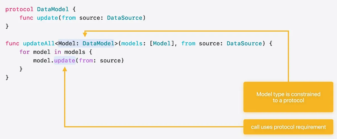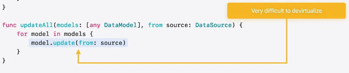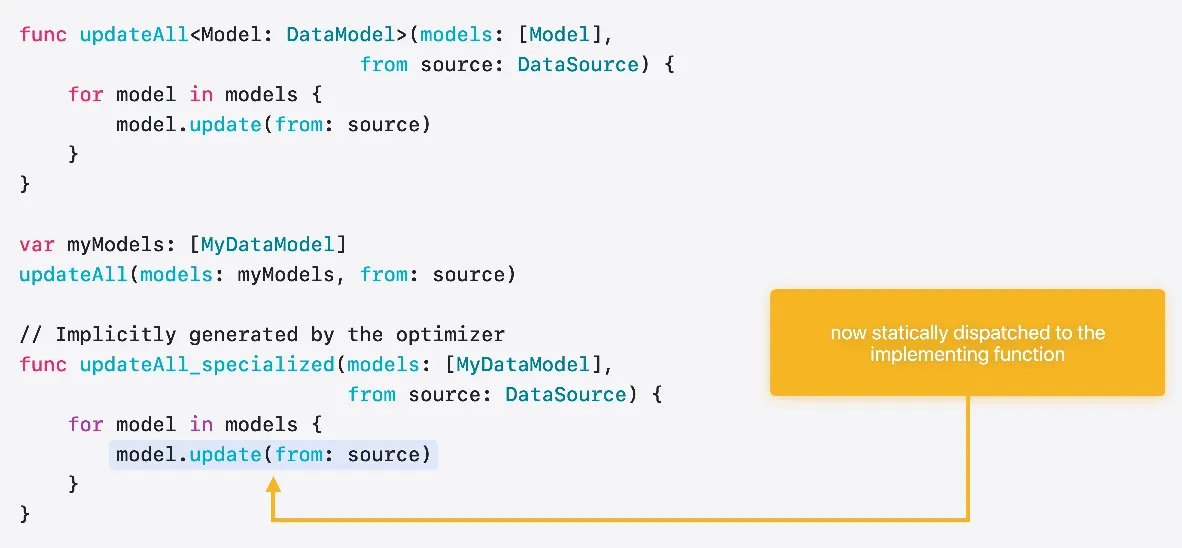 호출자가 호출되는 유형을 알 수 있다면 함수를 특수화할 수도 있습니다 여기에서는 알려진 유형의 배열로 호출하고 있습니다 이러한 호출은 옵티마이저가 손쉽게 인라인 처리하거나 정확히 이 인수 유형에 특수화된 버전의 함수를 생성할 수도 있습니다 이렇게 하면 제네릭과 관련된 추상화 비용이 제거되며 MyDataModel이 준수하는 구현에서 직접 update를 호출할 수 있습니다