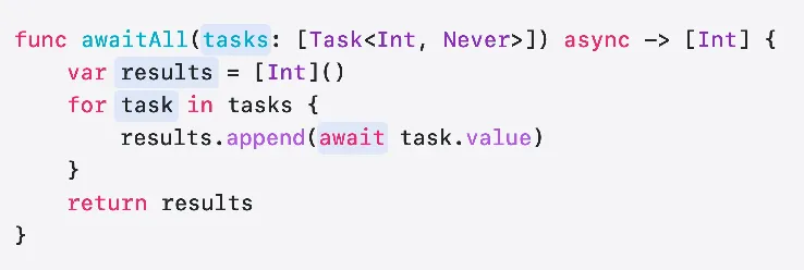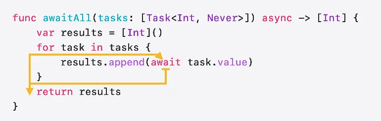 나머지 부분 함수가 await 이후에 실행됩니다 먼저 기다렸던 작업의 결과를 출력 배열에 추가하고 루프를 계속 실행하려고 합니다 더 이상 작업이 없으면 비동기 함수 호출자에게 반환됩니다 작업이 더 있다면 루프를 반복하고 다음 작업을 기다립니다