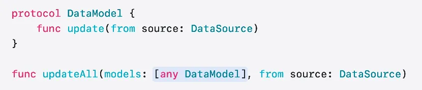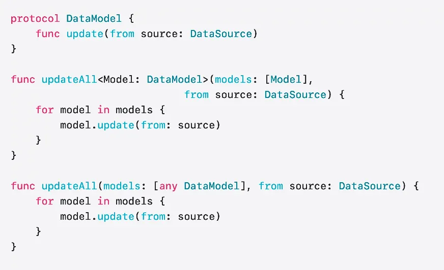 두 번째 함수([any DataModel])는 다양한 데이터 모델로 구성된 배열을 받습니다 더 유연하죠 다양한 유형의 데이터 모델을 사용한다면 이렇게 해야 할 겁니다 그러나 배열의 요소들이 각자 다른 동적 유형을 가져 배열에 값이 조밀하게 채워지지 않습니다