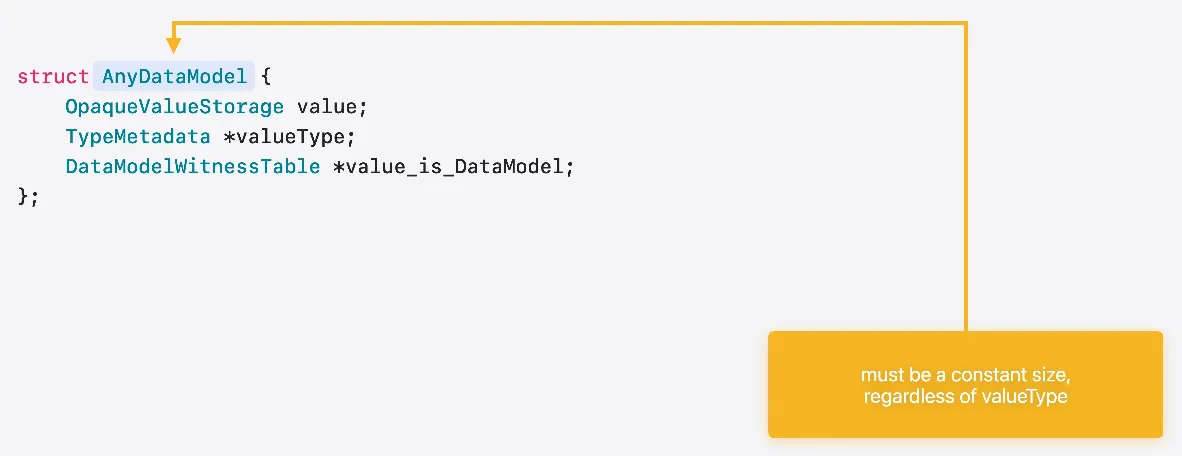 AnyDataModel 같은 프로토콜의 인라인 표현을 C로 나타내면 이렇습니다 값을 저장할 공간이 있고 값의 유형과 준수할 사항을 저장할 필드가 있습니다