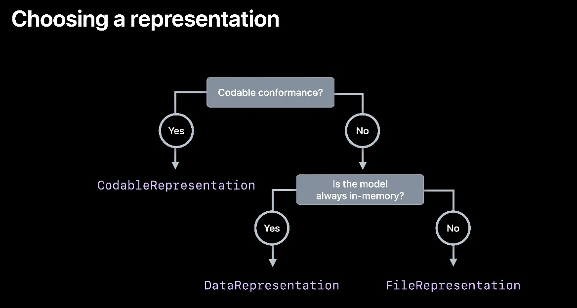 주의해야 할 중요한 표현이 세 가지 있는데요 CodableRepresentation, DataRepresentation, FileRepresentation입니다