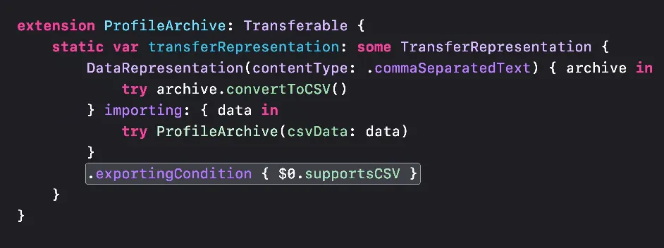 코드에 적용하려면 .exportingCondition을 씁니다 주어진 아카이브가 CSV를 지원하지 않는다면 그 형식으로 내보내진 않을 겁니다