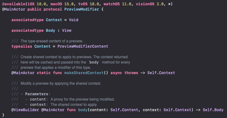 여기서 반환된 컨텍스트는 캐시되어 이 유형의 모디파이어를 적용하는 모든 프리뷰의 body 메서드에 전달됩니다.