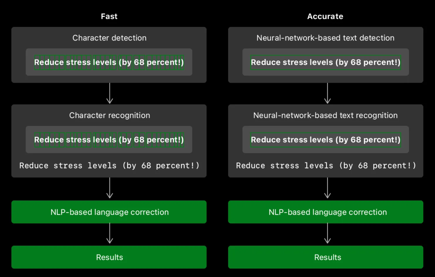 프레임워크의 문자 감지 기능을 사용해서 개별문자를 찾은다음, 작은 머신 러닝 모델을 사용하여 개별 문자와 단어를 인식