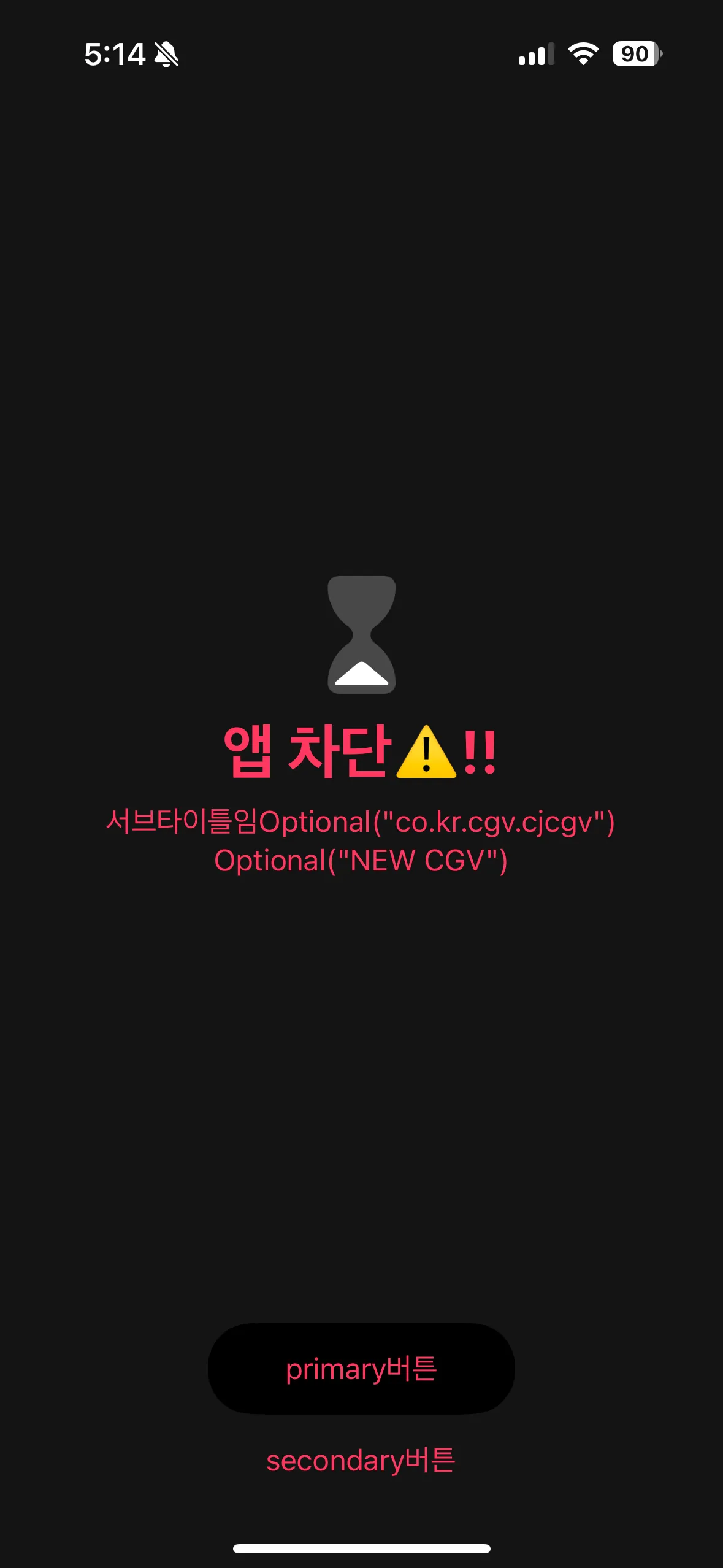 CGV앱을 제한걸고(시뮬에서 테스트불가능해서 실제폰에서 테스트) CGV앱을 실행시키면 앱 차단이 노출됩니다.