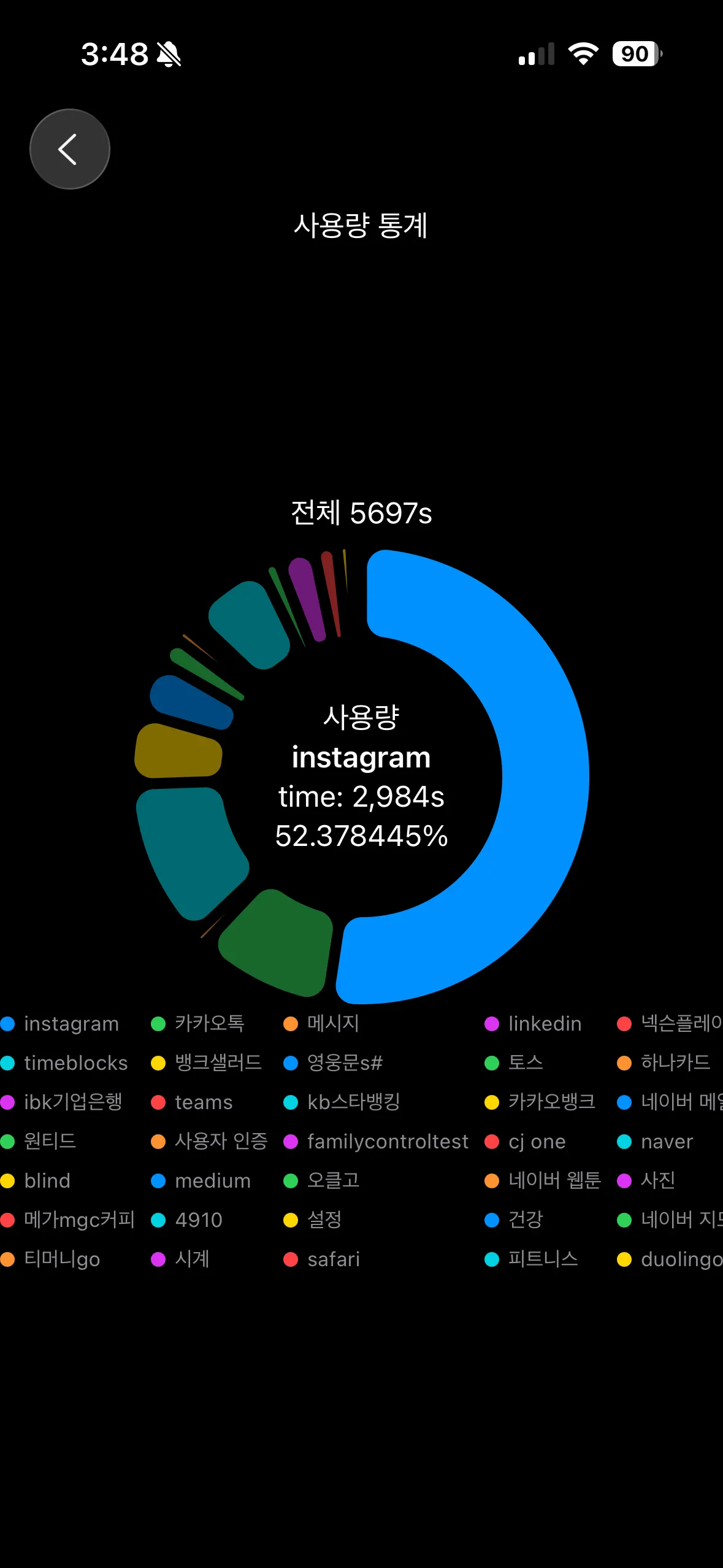 차트를 터치하면 해당 앱의 이름, 사용시간, 비율을 확인 할 수 있습니다.