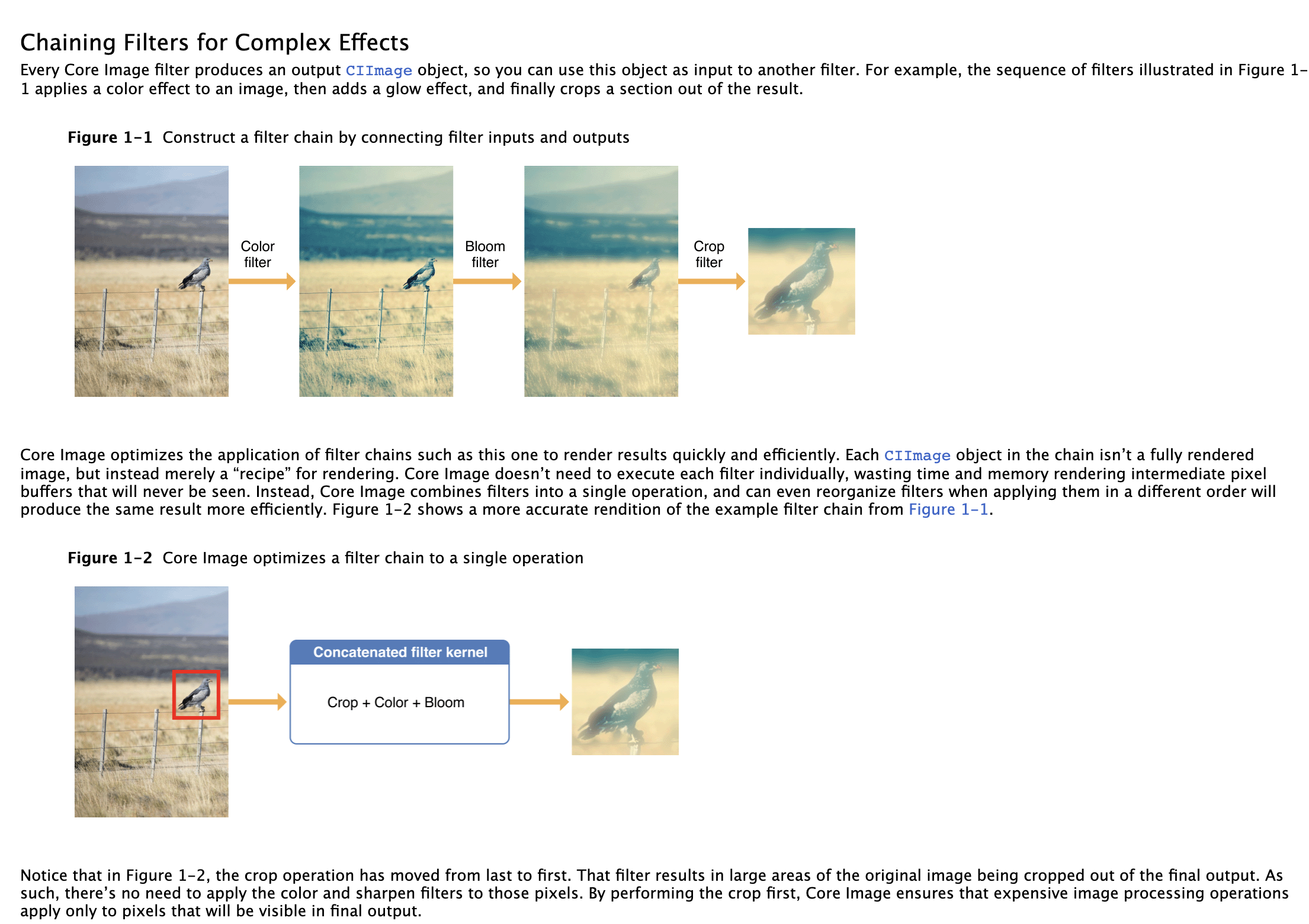 Core Image는 이와 같은 필터 체인의 적용을 최적화하여 결과를 빠르고 효율적으로 렌더링합니다.