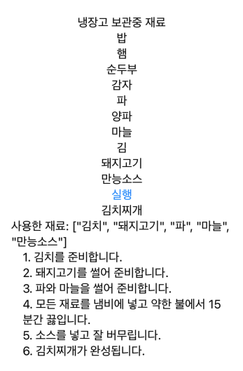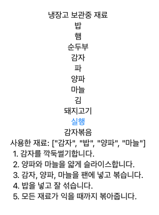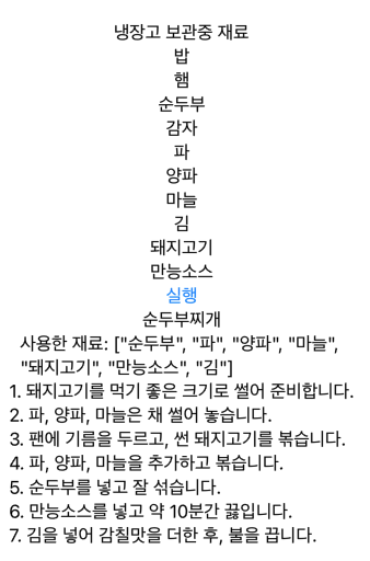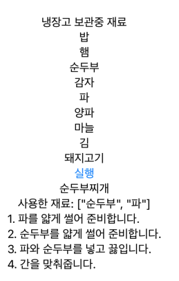 냉장고 내에있는 재료를 통해 어떤 음식을 만들수잇는지 요청하는 데모앱을 만들어보려합니다