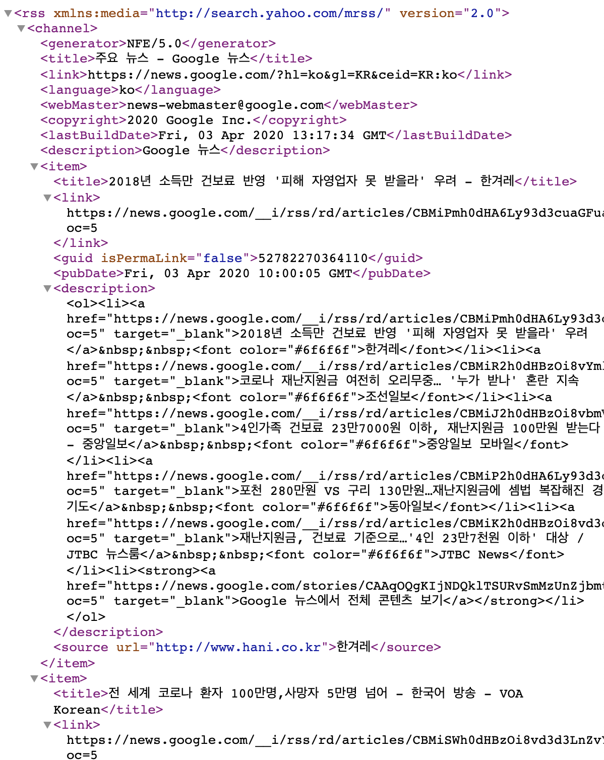 예시로 구글뉴스의 RSS주소를 가져왔어요