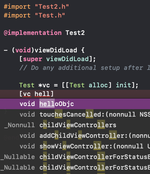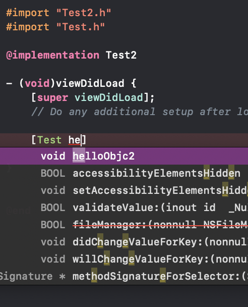 만약 Test.h에서 helloObjc2를 선언 하지않는다면 위의 항목에서 보이지 않을거에요!! 사용할 수 없는거죠