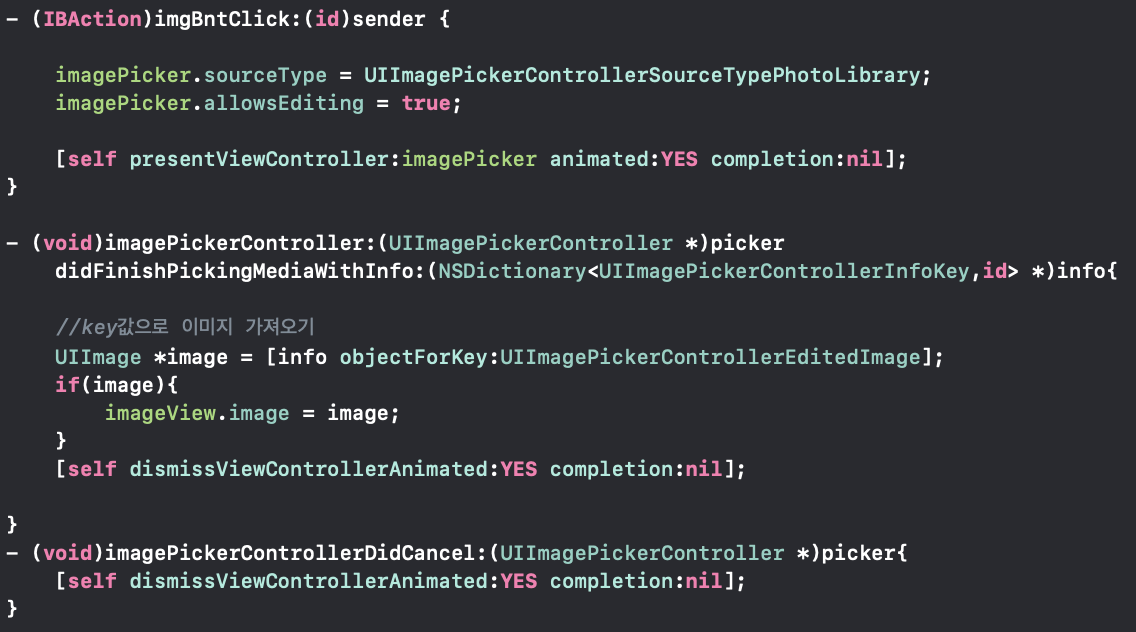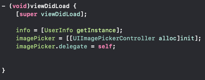 헤더파일 interface옆에 위에와같이 <UIImagePickerControllerDelegate,UINavigationControllerDelegate>를 추가해줍니다