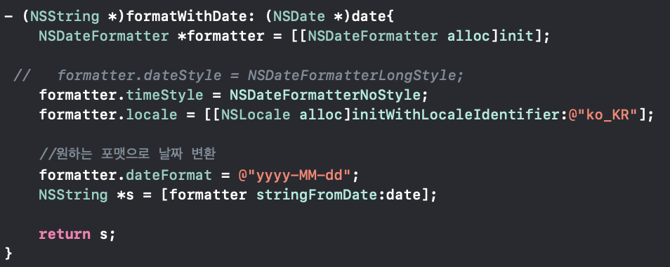 마지막에 [formatter stringFromDate] 를이용해서 NSString형으로 바꿀 수 있어요