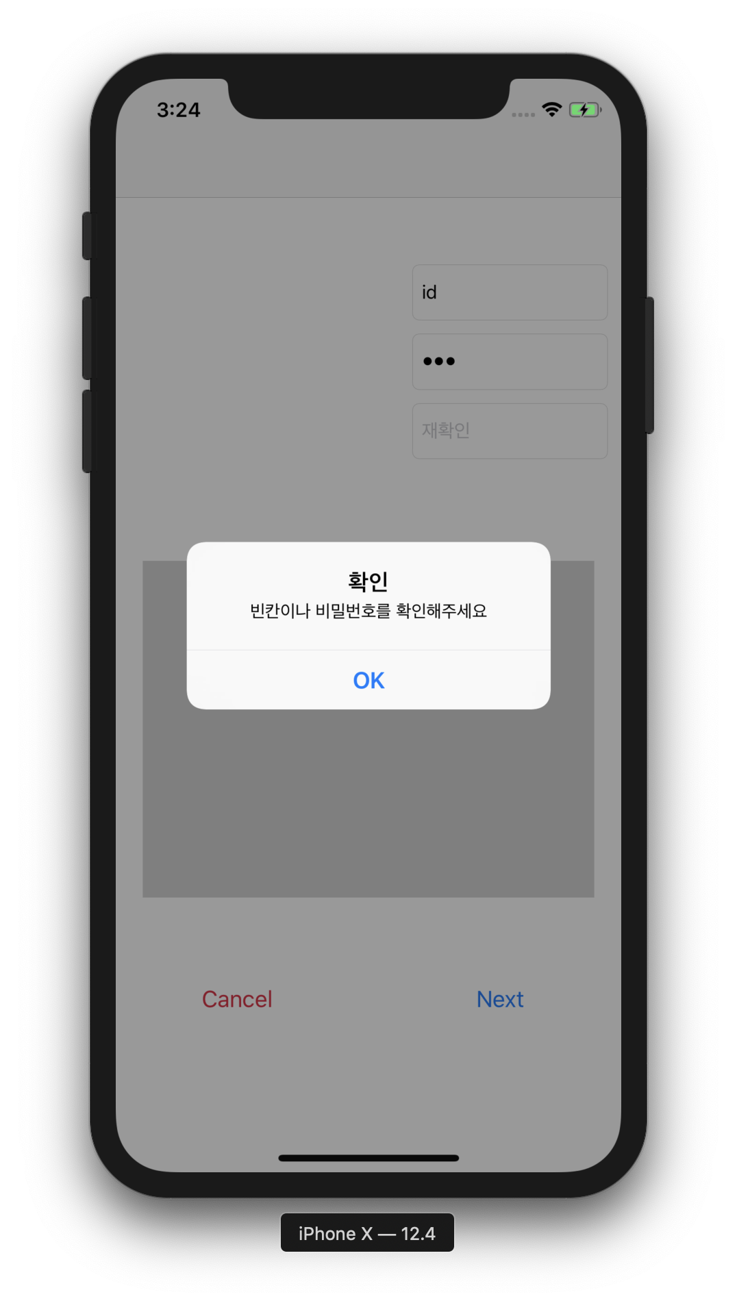 UIAlertController *alert = [UIAlertController alertControllerWithTitle:@"확인" message:@"빈칸이나 비밀번호를 확인해주세요" preferredStyle: UIAlertControllerStyleAlert];