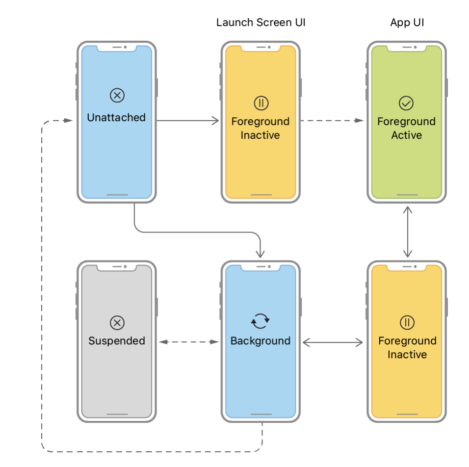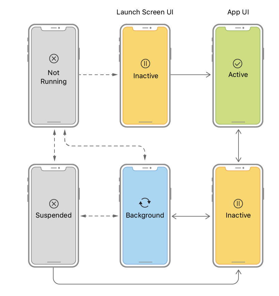 Inactive - 앱의 상태변화시에 거치게되구요, 이벤트는 받지않는 상태에요 (Background로 전환시 거치는 단계)