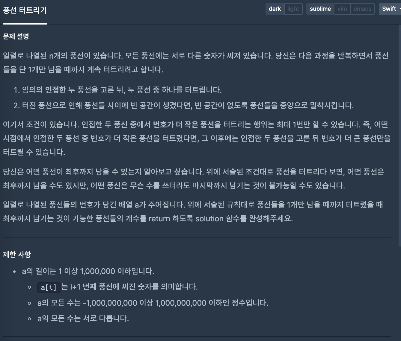 [0..<x]의 최솟값과 [x+1..<end]의 최솟값이 x번째 수보다 모두 작으면 x번째가 삭제당하므로 안됌